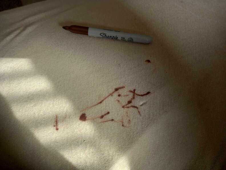The other day, Erik was at home with Flora when, seizing upon an unsupervised moment, the pup picked out a new chew toy among her things — in this case, a brown permanent marker.