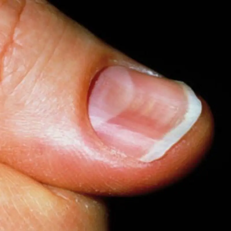 Kidney disease may affect circulation and nutrient balance, sometimes causing nail beds to appear pale or showing a pattern called “half-and-half nails,” where part of the nail looks white and the rest darker.