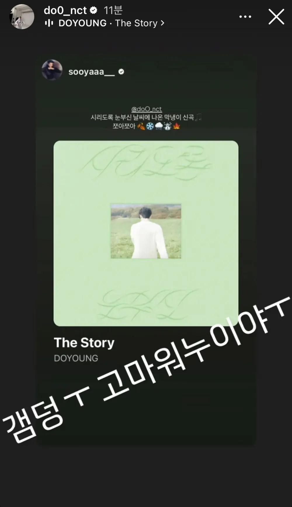 In light of the release of Doyoung's "The Story" earlier this week, BLACKPINK's Jisoo wrote on her Instagram story, "Maknae's new single, released when the weather is dazzling. Love it love it."