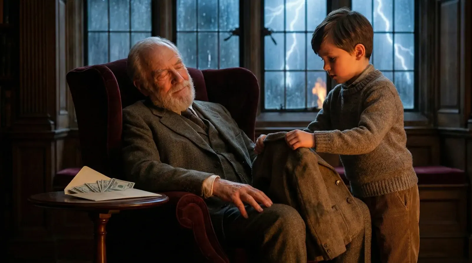 The library had been arranged like a stage. The fireplace glowed softly. Thunder rattled the windows. On the small mahogany table beside his chair lay the bait: an open cream envelope stuffed with crisp hundred-dollar bills—five thousand dollars. Carelessly placed, as if forgotten by a senile old man.